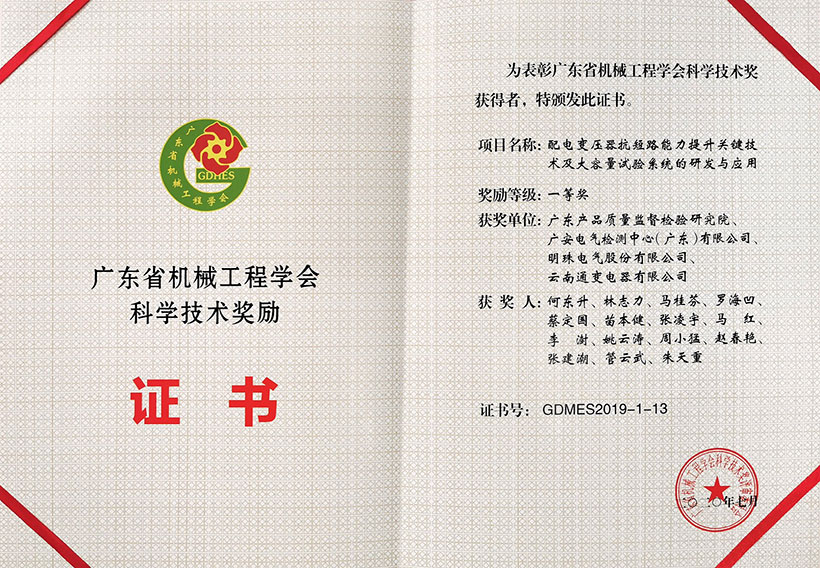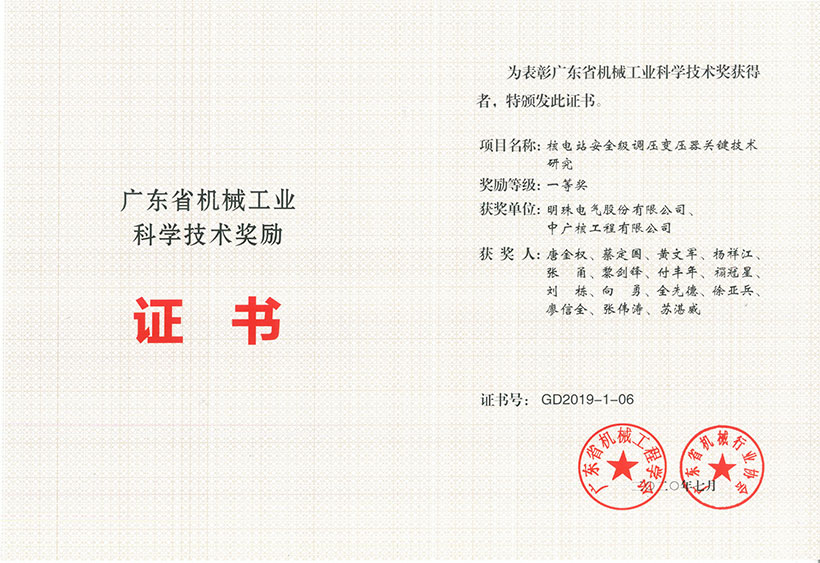 近日,明珠電氣“核電站安全級調壓變壓器關鍵技術研究”項目(與中廣核工程有限公司聯合開展)以及“配電變壓器抗短路能力提升關鍵技術及大容量試驗系統的研發與應用”項目(由廣東產品質量監督檢驗研究院主持),同時榮獲2019年度廣東省機械工業科學技術獎勵一等獎和2019年度廣東省機械工程學會科學技術獎勵一等獎。